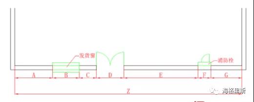 测量前根据库房现实情况,画一个草图,将水管、消防栓、门、窗等可能对货架造成影响的物品在草图中标注。用测距仪量库房四周的长宽高总尺寸,如无法一次测量,可分段多次测量叠加计算。对于长方形的库房,库房两端墙的总长度差额小于20mm时,可选最小值作为测量长度。当差额大于5mm,小于10mm时,建议量库房两端墙总长的同时,在库房中间左右位置再次测量总长,以减小误差。以下是图例: