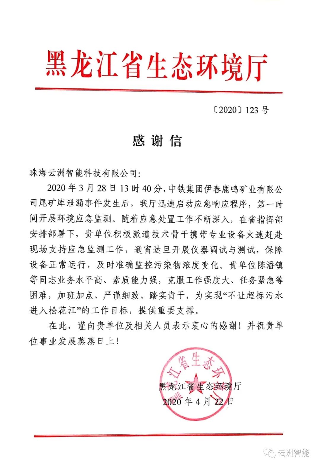 在接到黑龙江省生态环境监测中心的请求后,云洲智能立即响应,第一时间派出技术骨干,连夜从最接近事故点的辽宁沈阳紧急调派采样无人船,跋涉一千多公里,在清晨赶到现场展开监测应援工作。刚到达监测点时,气温低,水面污染比较严重,河水浑浊度很高,云洲技术人员马不停蹄安装调试好设备,连续2天,每隔2-4小时操控无人船前往断面流速1-2m/S的水面上进行采样,获得了大量一手的水质样品——无人船的到来使得采样的点位和范围迅速增加,也令污染物监测数据信息量大大增加,为处置措施的制定和调整提供了决策依据。日前,云洲智能收到了黑龙江省生态环境厅发来的感谢信,对云洲智能在此次尾矿库矿砂泄漏应急工作中作出的贡献表示了肯定,感谢信中说,云洲智能积极支持应急监测工作,技术人员通宵达旦开展仪器调试与测试,及时准确监控污染物浓度变化,为实现“不让超标污水进入松花江”的工作目标提供了重要支撑。
