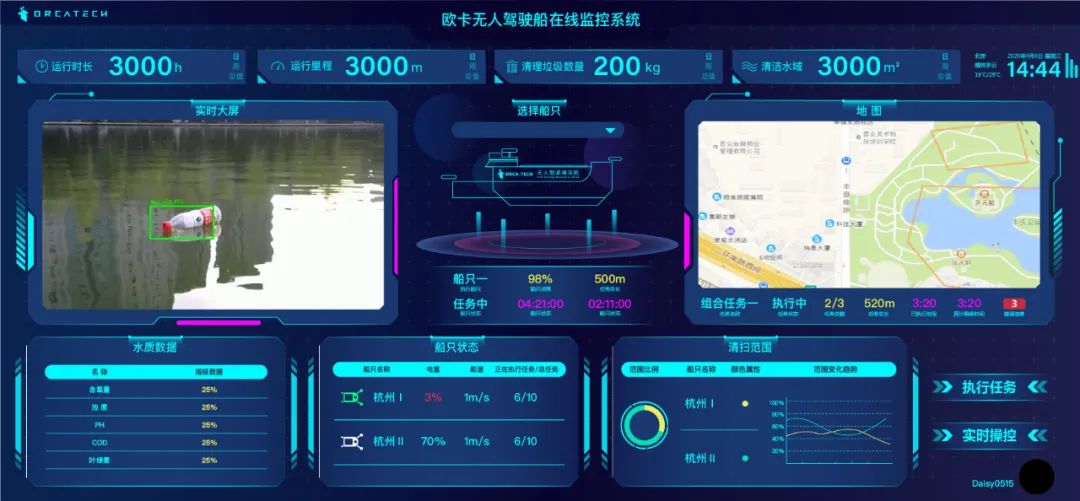 除了正常的水面清洁工作之外,欧卡智能利用水面无人船为平台,在乌镇逐步搭建一个集水面清洁、水质检测、无人巡检和水文测绘为一体的水体解决方案系统,配合欧卡无人驾驶清洁船和欧卡无人船在线监控系统,实现科技智慧的水面无人化管理。