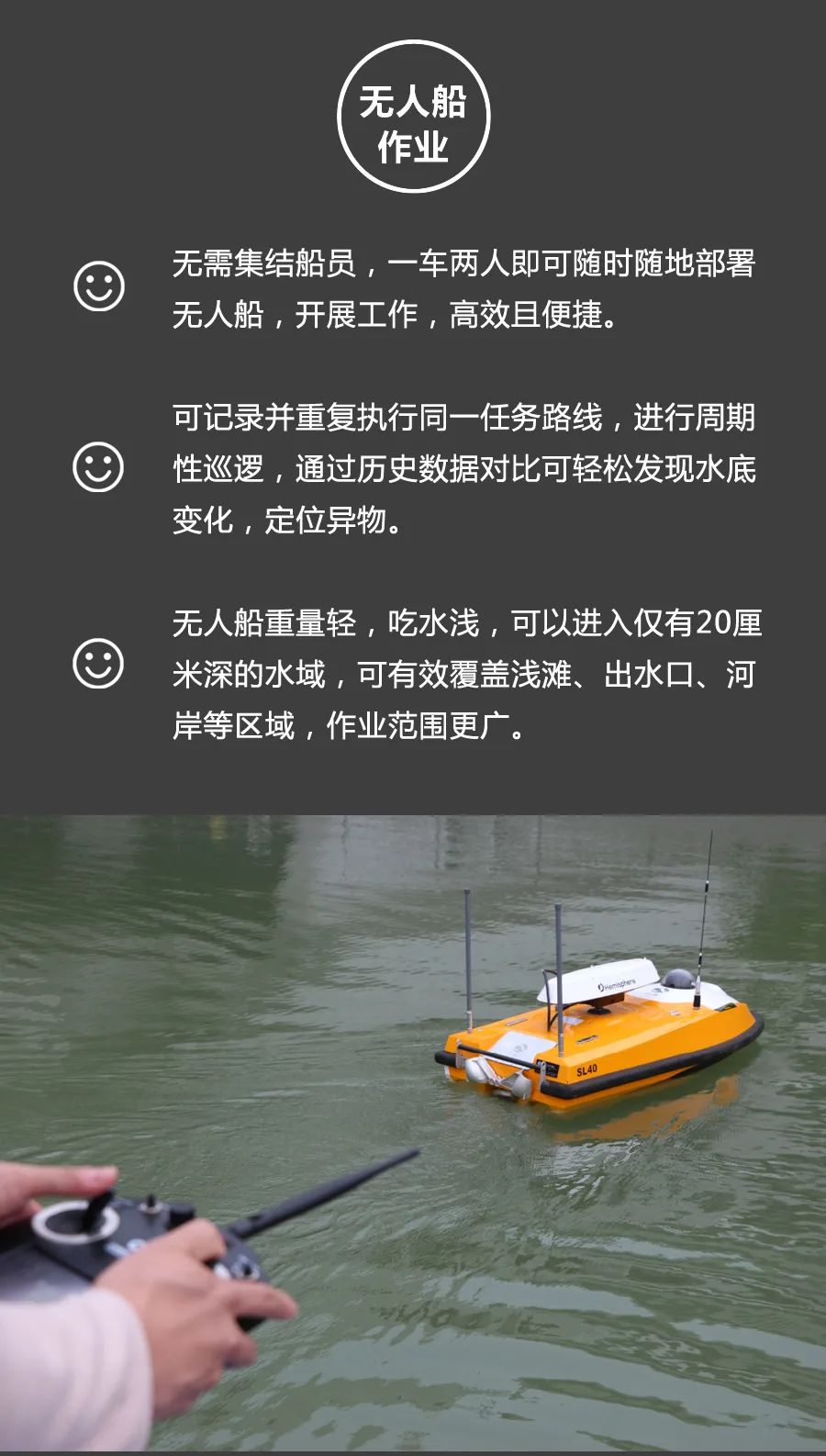 针对人员难以开展工作的水环境污染区域,无人船可全天候进行水上水下污染源定位排查工作,助力环境监察执法部门让非法排污企业无所遁形。
