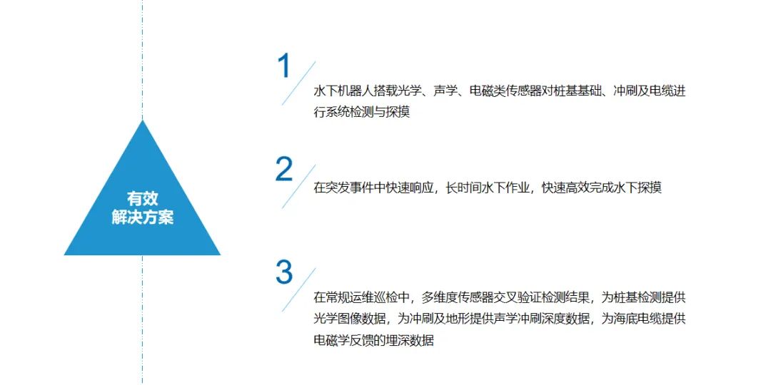 随着水下机器人技术的不断发展,以水下机器人为核心的海上风电水下运维对上述问题形成了一套有效的解决方案。通过水下机器人搭载光学、声学、电磁类传感器对桩基基础、冲刷及电缆进行系统检测与探摸。在突发事件中快速响应,长时间水下作业,快速高效完成水下探摸;在常规运维巡检中,多维度传感器交叉验证检测结果,为桩基检测提供光学图像数据,为冲刷及地形提供声学冲刷深度数据,为海底电缆提供电磁学反馈的埋深数据。