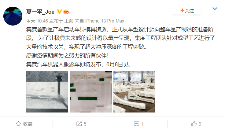 5月25日消息,今日,集度汽车CEO夏一平通过社交媒体表示,集度首款量产车启动车身模具铸造,正式从车型设计迈向整车量产制造的准备阶段。夏一平指出,为了让极具未来感的设计得以量产呈现,集度工程团队针对成型工艺进行了大量的技术攻关,实现了超大冲压深度的工程突破。
