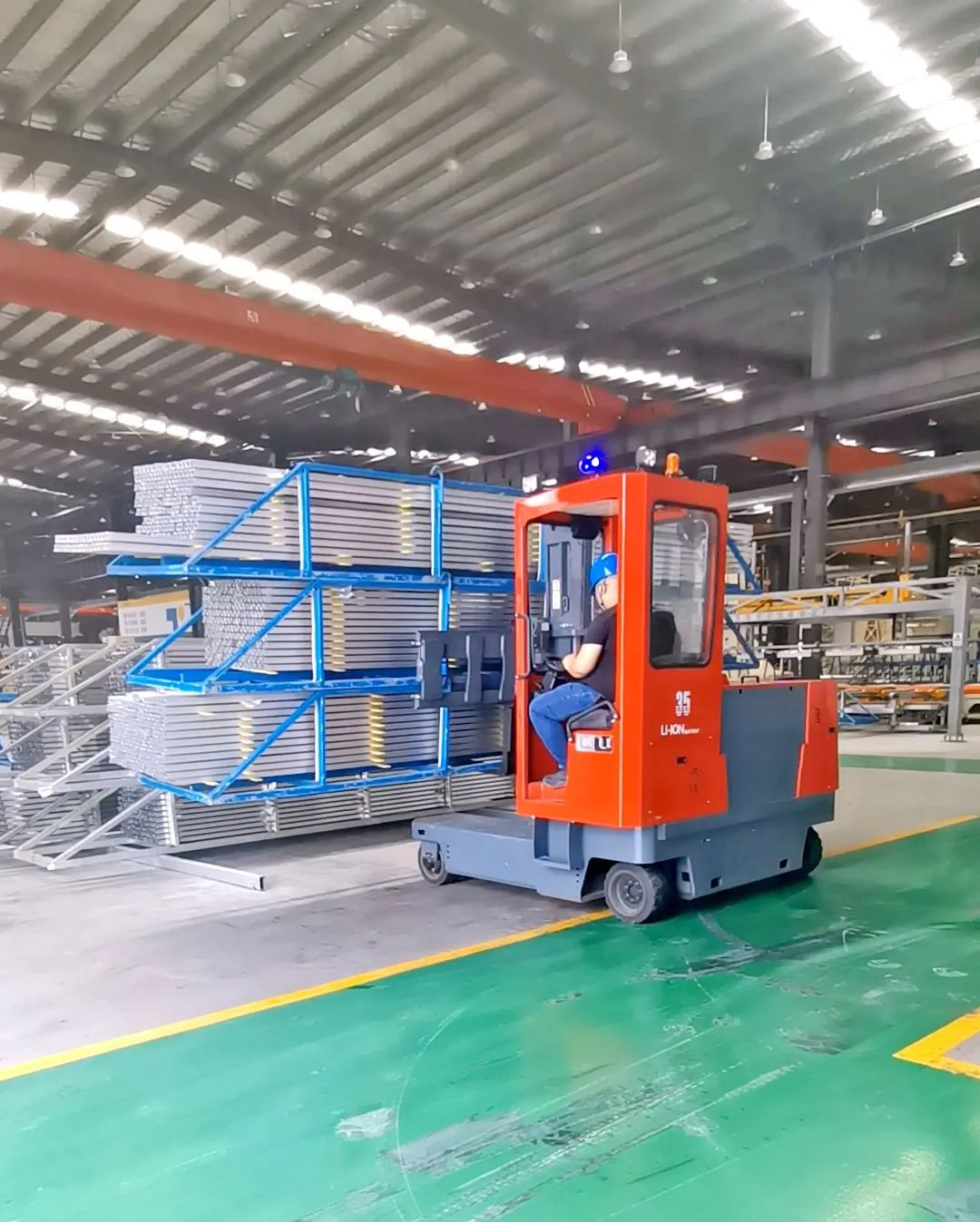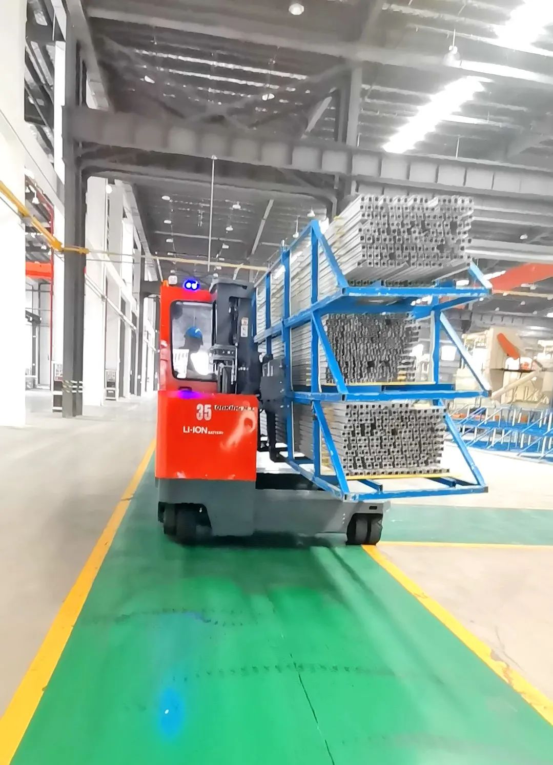 2、MQC35全向叉车具备多种驾驶模式,搬运铝棒时侧向行驶通道宽度仅需2.9米,堆垛高度可增加60%;