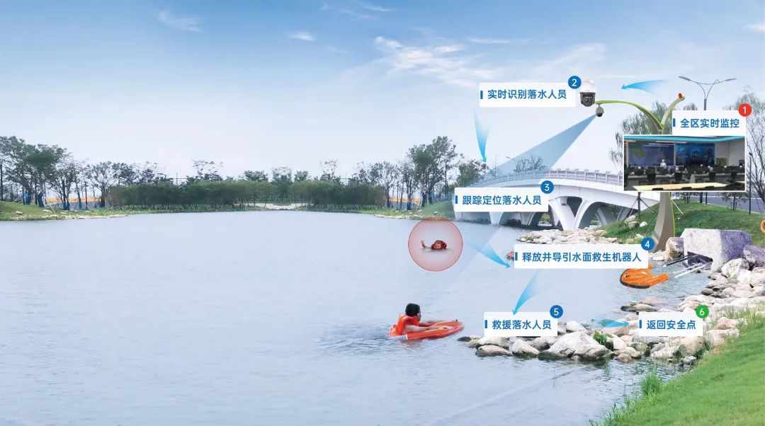 该系统集合分布式机器视觉,水面智能救生机器人,机器人导航与控制,智能决策和路径规划等前沿技术于一体,可以有效提高水上突发事件的报警与应急联动能力,有效解决了传统水上救生的巡视覆盖面小,发现落水人员的随机性大,岸线水面不利于人工实施救援等问题,有效地保障市民、游客的生命安全。