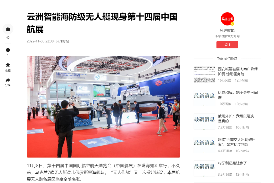 转载 2022-11-15 16:10 来源:云洲智能11月13日,第十四届中国航展正式落下帷幕。为期六天的盛会中,诸多先进的无人装备赚足眼球。飞鸿-97A无人机、“翼龙”-3、无人装甲车等新品首次亮相,攻击-2无人机首次振翅中国航展,更有云洲智能两款成熟无人船艇型号实艇展出,联袂呈上海陆空无人装备“全家桶”,让观众直呼过瘾。