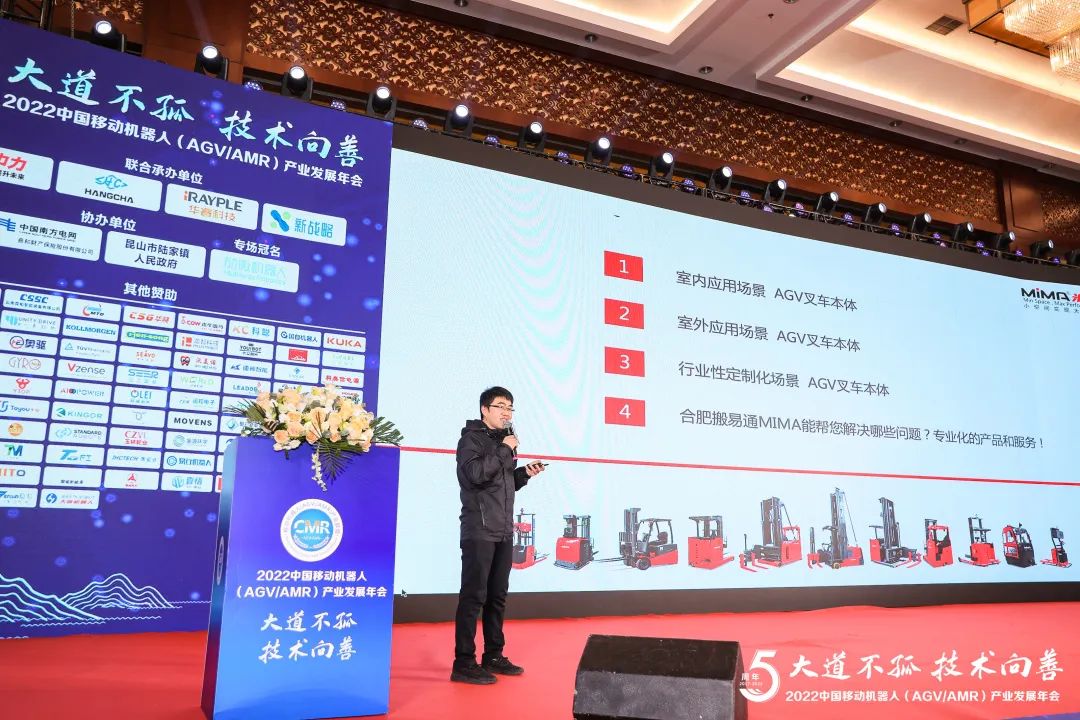 在本次年会联盟成员大会上,合肥搬易通科技发展有限公司直销副总任飞带来的演讲主题是《全系列专业化AGV叉车本体助力室内外无人搬运高速发展》,任总和参会嘉宾分享了合肥搬易通MiMA的AGV叉车本体应用场景和解决方案。伴随着市场对无人叉车的认知成熟,促使企业进入批量化、全场景化及智能化的拓展阶段,作为叉车本体制造商,搬易通拥有十年AGV本体业务经验,同时打造了完整且完善的产品链,产品覆盖了室内、室外等多场景,可根据客户需要提供各类定制化的车体。