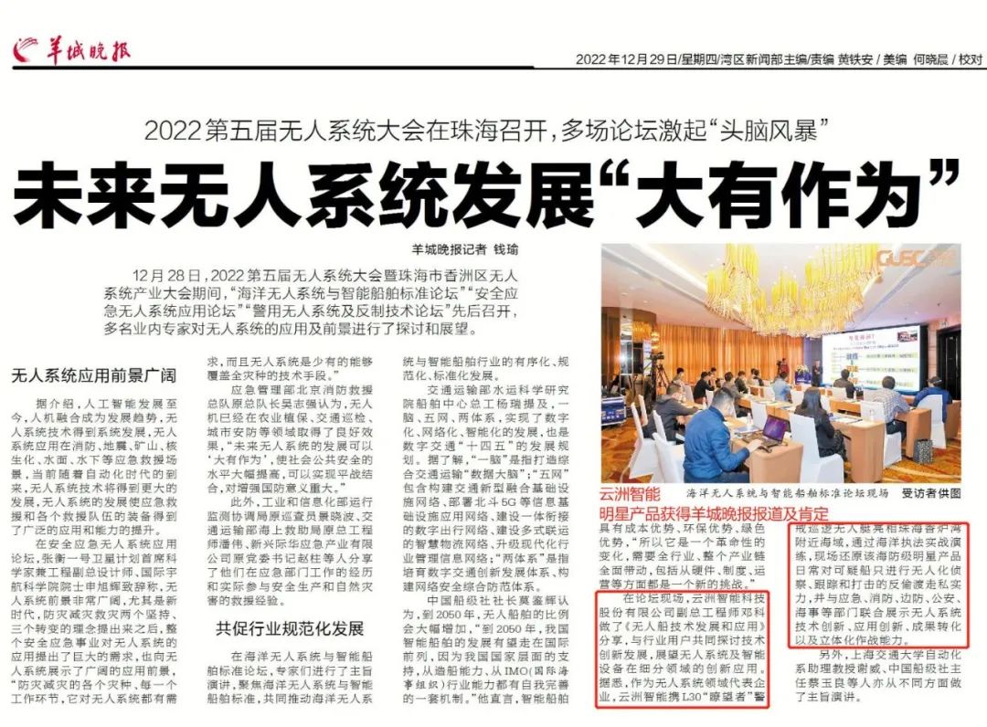 转载 2022-12-29 18:58 来源:云洲智能2022全球无人系统大会完美谢幕12月28日,“2022第五届无人系统大会暨珠海市香洲区无人系统产业大会”圆满落幕。云洲智能在本届大会上亮点频频,不仅在现场向政府相关领导和行业客户演示产品、分享技术、对接供需,还吸引了羊城晚报、珠海电视台等众多媒体报道。