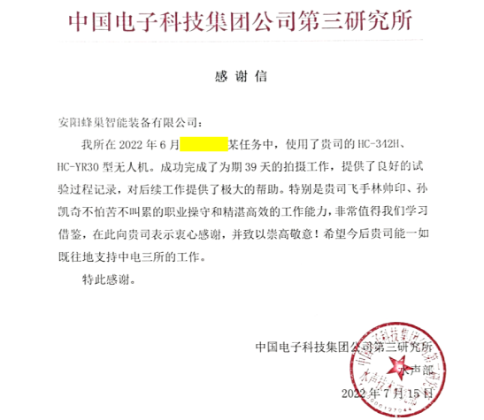 这封感谢信,是中电三所对蜂巢航宇无人机优异的性能、飞手专业水平和攻坚克难的工作作风高度肯定,也是蜂巢航宇管理团队戮力同心、团结拼搏、协作奋进的成果。