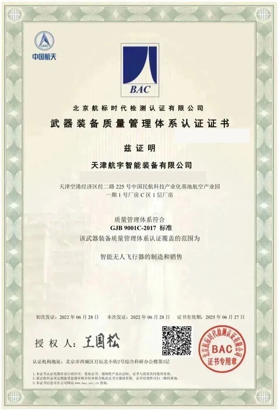 2022年6月28日,蜂巢航宇子公司天津航宇智能装备有限公司成功通过武器装备质量管理体系认证。此次证书的获得,表明蜂巢航宇无人机产品符合军品标准,具备军品研发与生产的质量管控能力,对于公司进一步发展军工业务具有里程碑式意义!