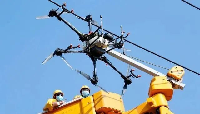 一架重约25公斤的六旋翼无人机在500千伏高压线杆塔附近飞行时,不慎撞到该杆塔的拉线上,被卡住无法动弹。幸好国网工作人员及时赶到,否则可能导致极其严重的后果。