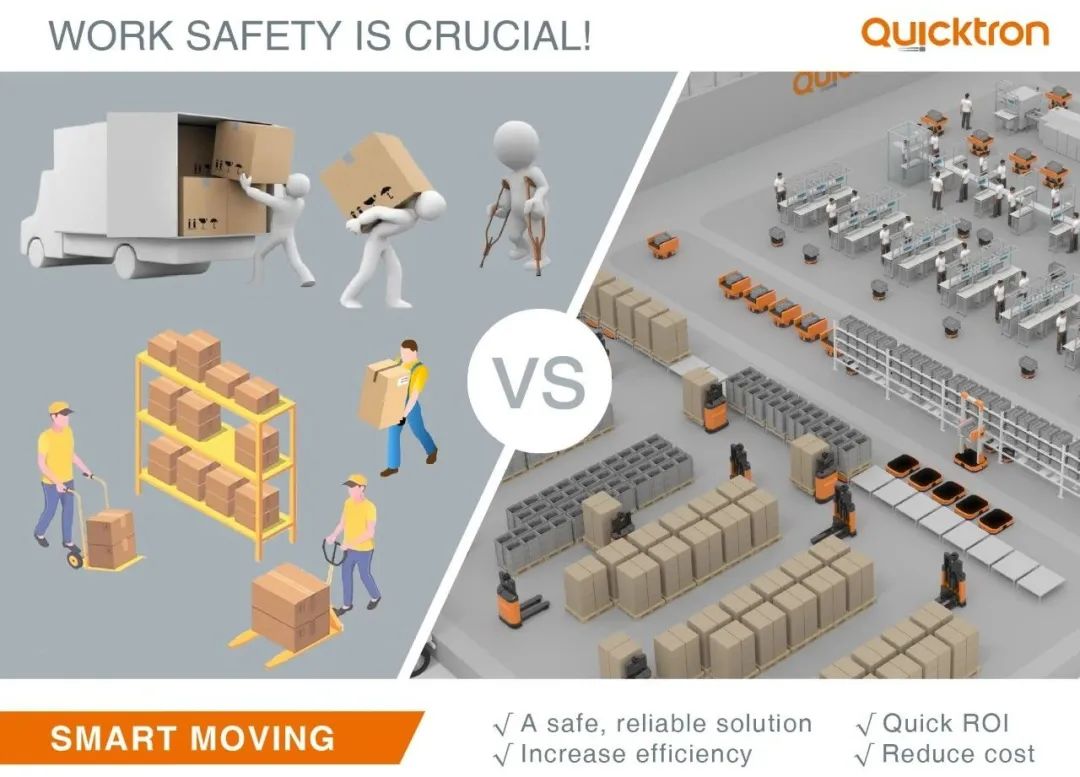 移动机器人可以完成体力要求高且具有潜在危险的任务,从而降低仓库、工厂等工作场所发生人员安全事故的风险。通过移动机器人执行重复、艰苦的搬运任务,不仅可以降低人类的劳动强度,还可以让人类专注于科技含量更高、价值更高的任务,从而提高员工的工作满意度。此外,移动机器人可以创造更符合人体工程学的工作环境,最大限度地减少工人身体的压力,并降低肌肉骨骼疾病的可能性。