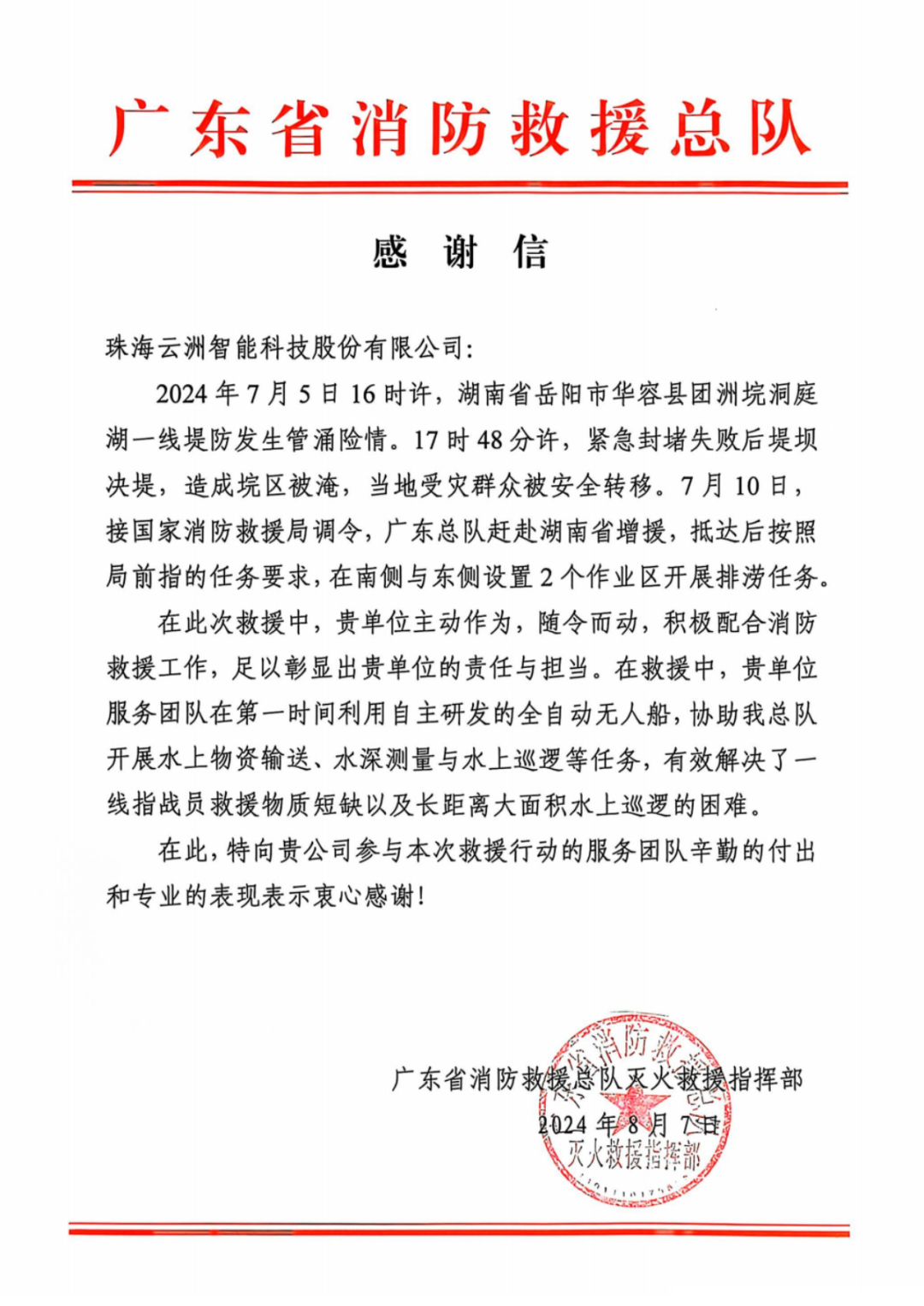 - 广东省消防救援总队感谢信:云洲无人船助力洞庭湖洪灾救援