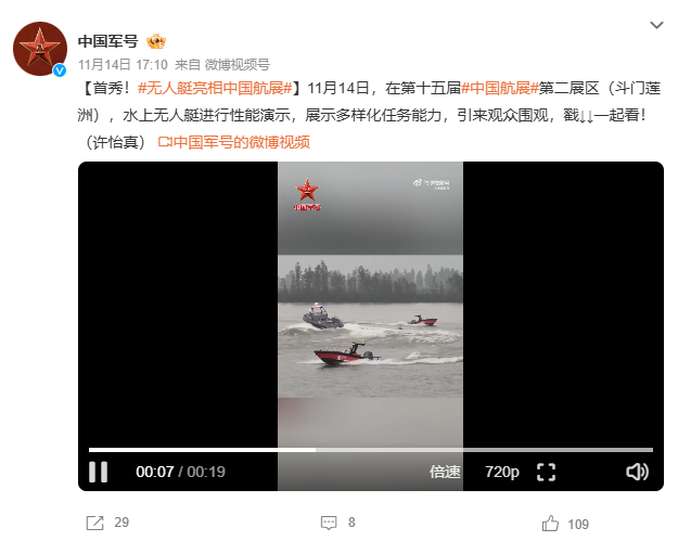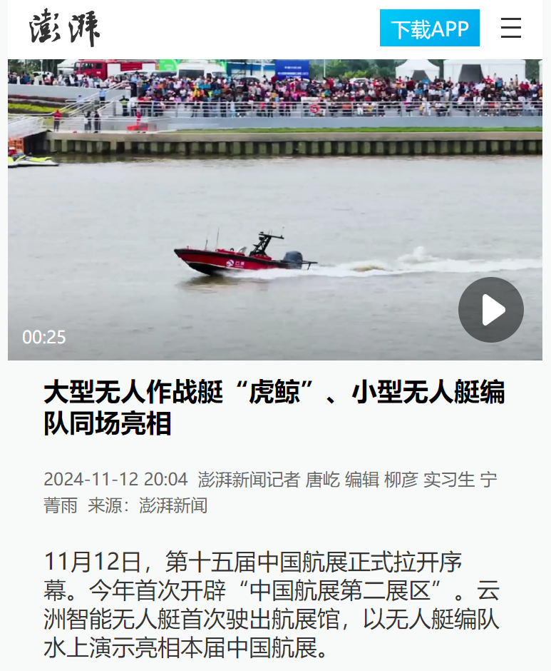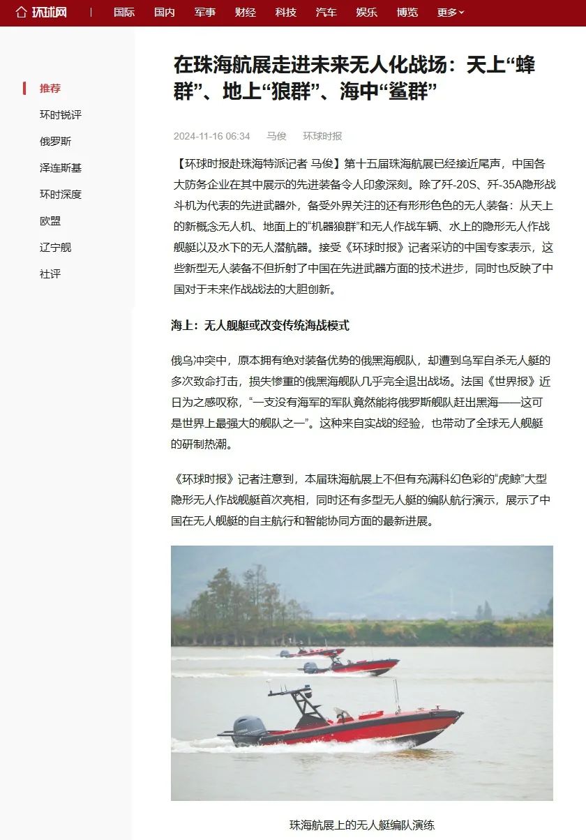 “《环球时报》记者注意到,本届珠海航展上不但有充满科幻色彩的“虎鲸”大型隐形无人作战舰艇首次亮相,同时还有多型无人艇的编队航行演示,展示了中国在无人舰艇的自主航行和智能协同方面的最新进展。”