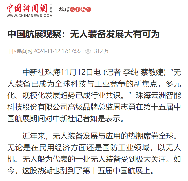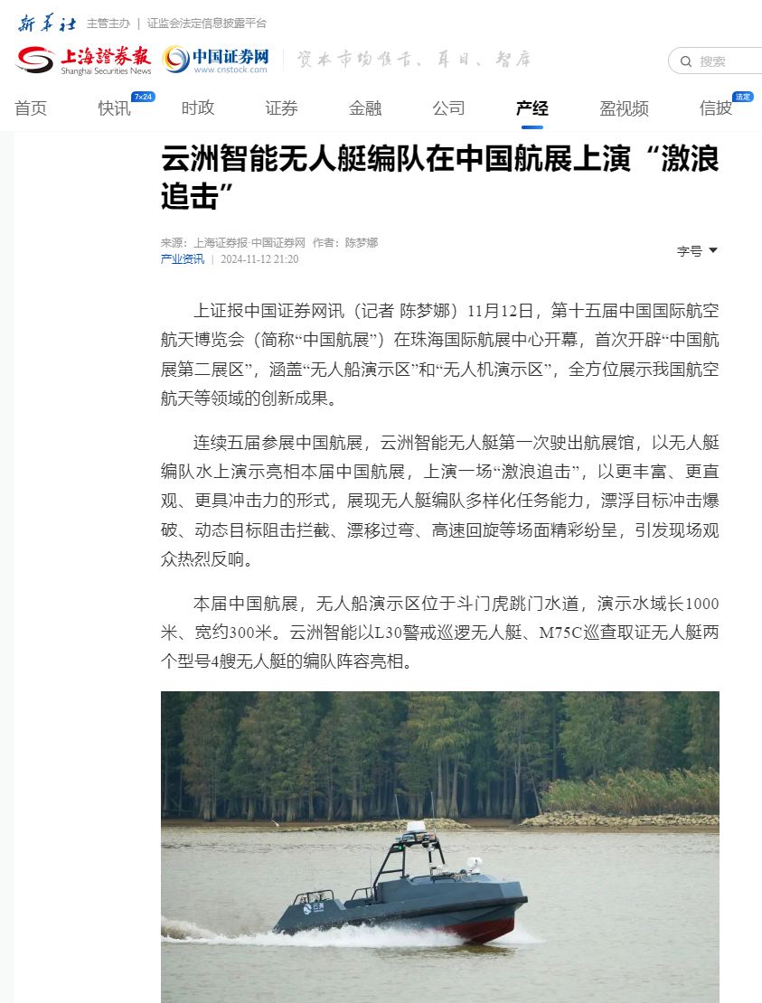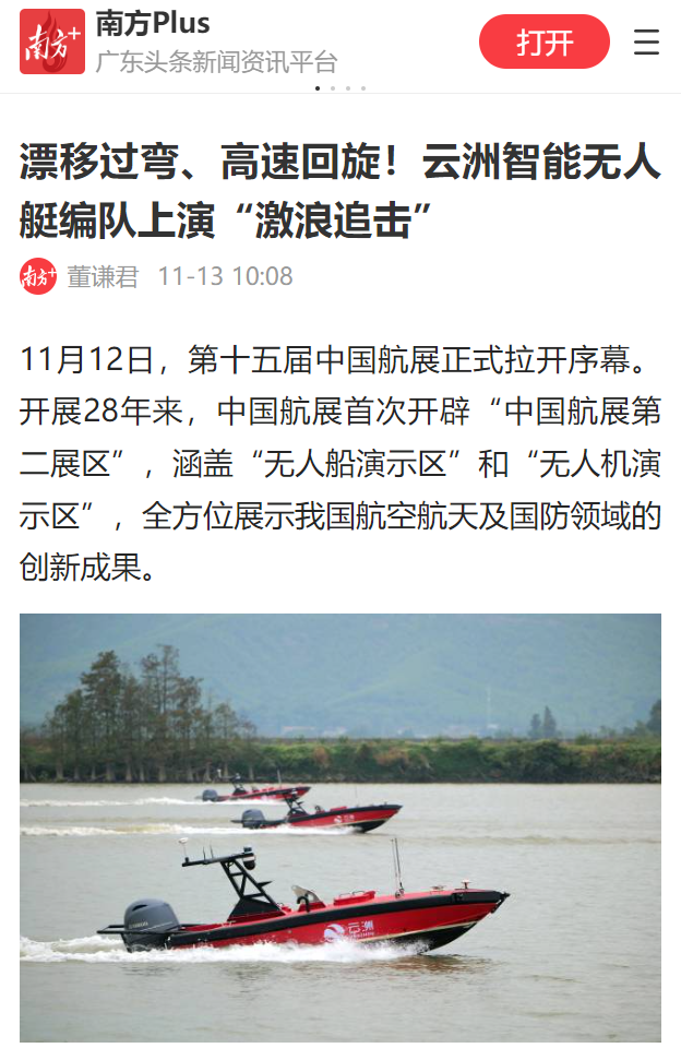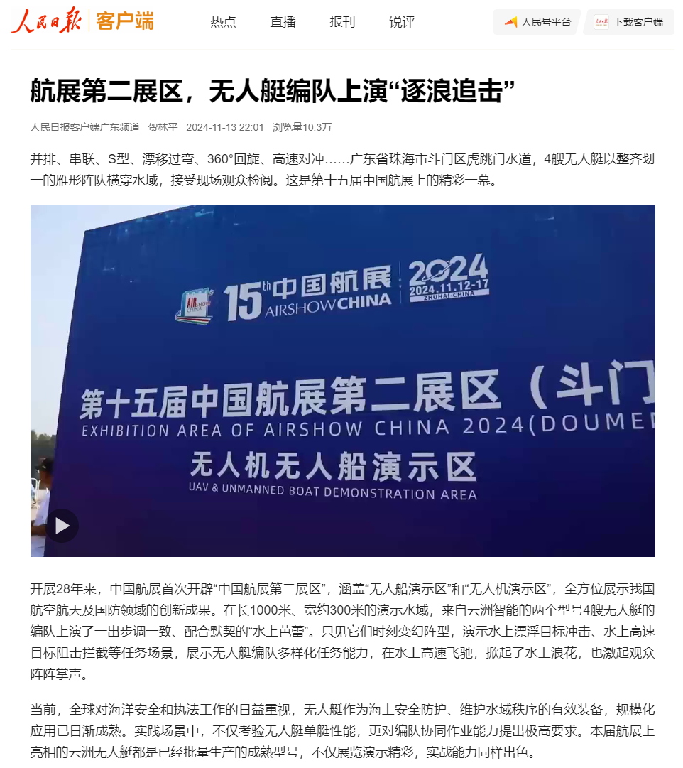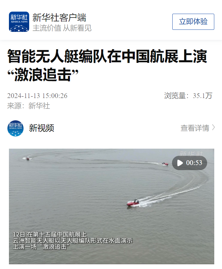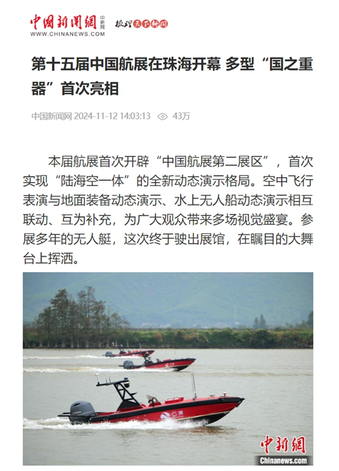 云洲智能在首次设立的“中国航展第二展区”进行了连续三天的无人艇编队水上动态演示,以多种任务场景展示了无人艇编队多样化任务能力,高速冲击的炫酷英姿激起了虎跳门水道的浪花,也掀起了媒体界的关注和报道热潮。央视总台《焦点访谈》、《正午国防军事》、《军迷行天下》等多个栏目对云洲智能无人艇进行了采访报道,央视新闻融媒体、央视军事融媒体以及广东台融媒体对现场进行了实时直播。此外,新华社、人民日报客户端、环球时报、科技日报、中国新闻网、中国军事网、中国军号、澎湃新闻、南方+、中国证券网、大湾区卫视、深圳卫视、珠海电视台、珠海特区报等众多媒体纷纷对云洲智能无人艇在中国航展的表现进行了广泛报道。
