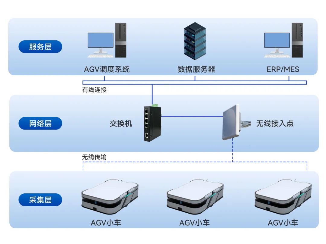 网络层作为服务层与采集层的连接,利用工业交换机和无线AP提供稳定网络连接,保障数据传输的实时性和可靠性,实现AGV与调度系统、以及其他AGV之间的通信。