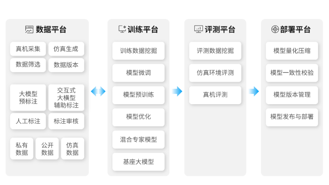 Geek+ Brain 使用基于千万量级公开数据集训练的预训练模型,再经过仿真数据与数年积累的行业数据进行模型后训练,最终得到可实时处理 2D/3D 图像阵列的高性能视觉抓取模型。同时, Geek+ Brain 构建数据生产、模型训练、评测、部署四大核心平台,提供完整的数据闭环支撑。
