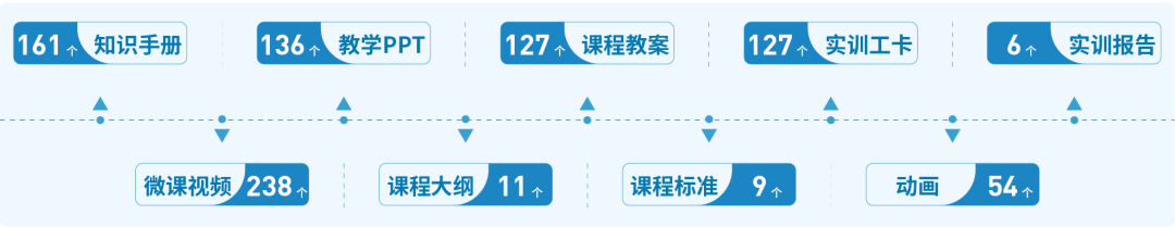 (3)每门课程涵盖丰富的教学资源,包含:微课视频、教学课件、课程教案、题库、实训工卡、动画等,助力院校学生有效开展线上学习。