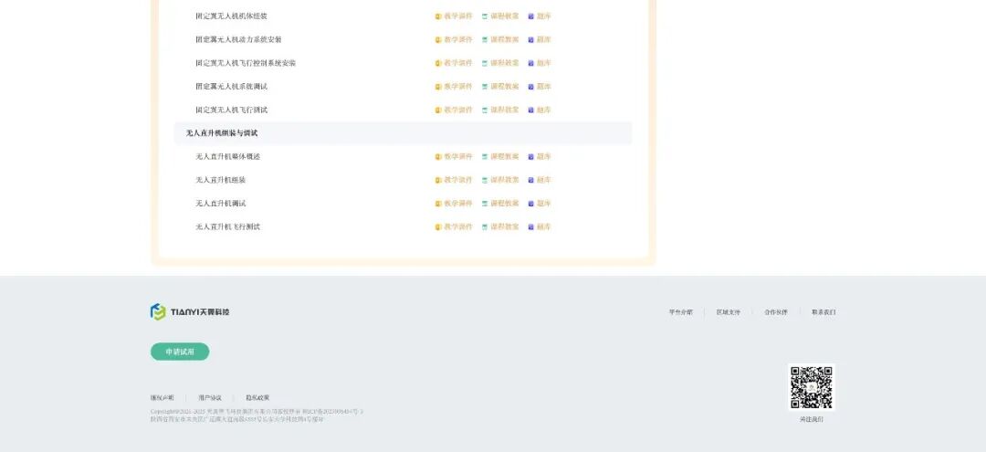 依据国家专业教学标准,搭建全套的课程体系,承载天翼自研课程几十门,涵盖无人机专业基础课、无人机专业核心课、无人机专业拓展课三个模块,助力老师各类课程授课需求,未来会持续更新新课程模块。