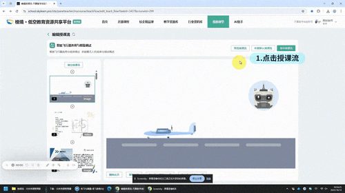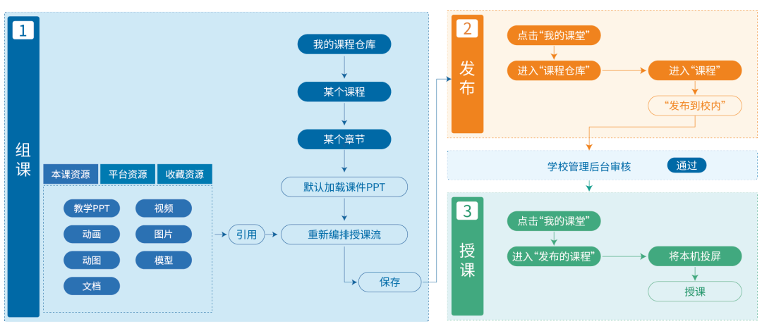 老师可为一节45分钟左右的课堂编排授课流,灵活插入全平台及自有的视频、虚拟仿真、课件等各类资源,打造一节基于丰富融媒体资源的精品课堂,让每次上课都生动高效。
