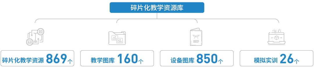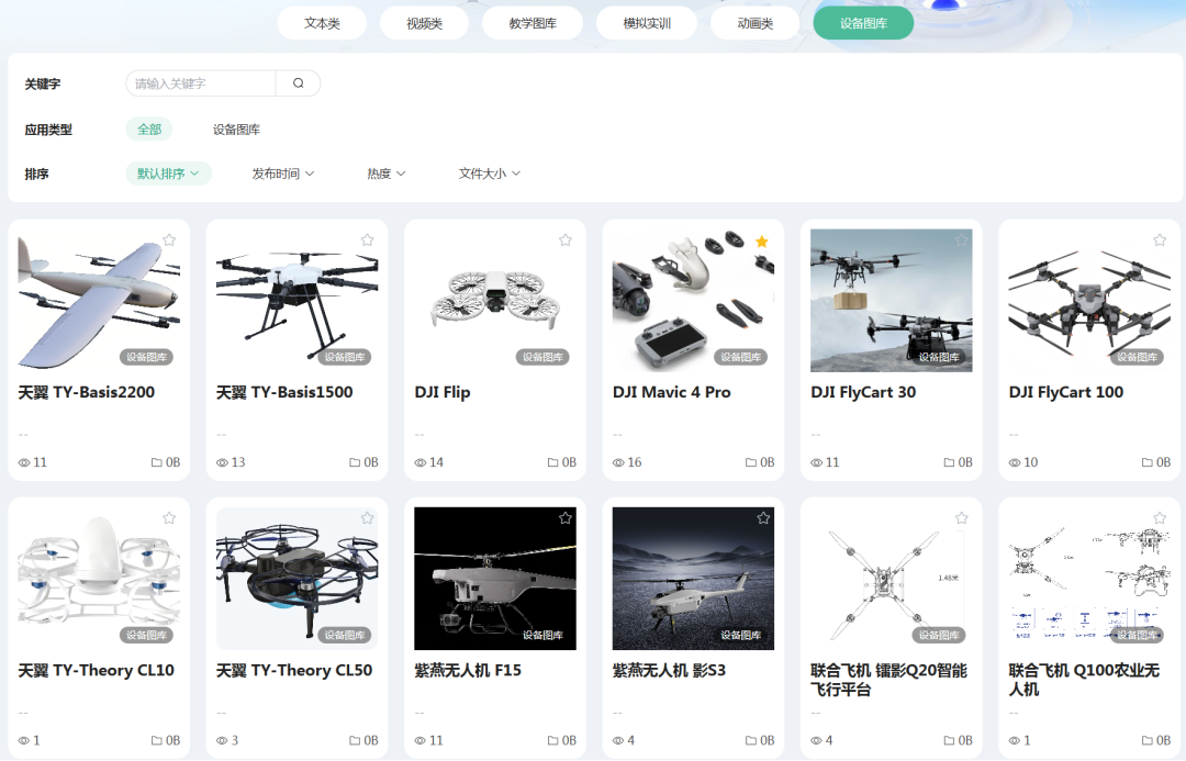碎片化教学资源库共计涵盖1905个教学资源,包含与各类无人机教学知识相关的教学资料、教学课件、课程教案、视频微课等。同时,涵盖教学图库、设备图库及模拟实训共计4大板块,助力院校老师日常灵活的教学使用需求。