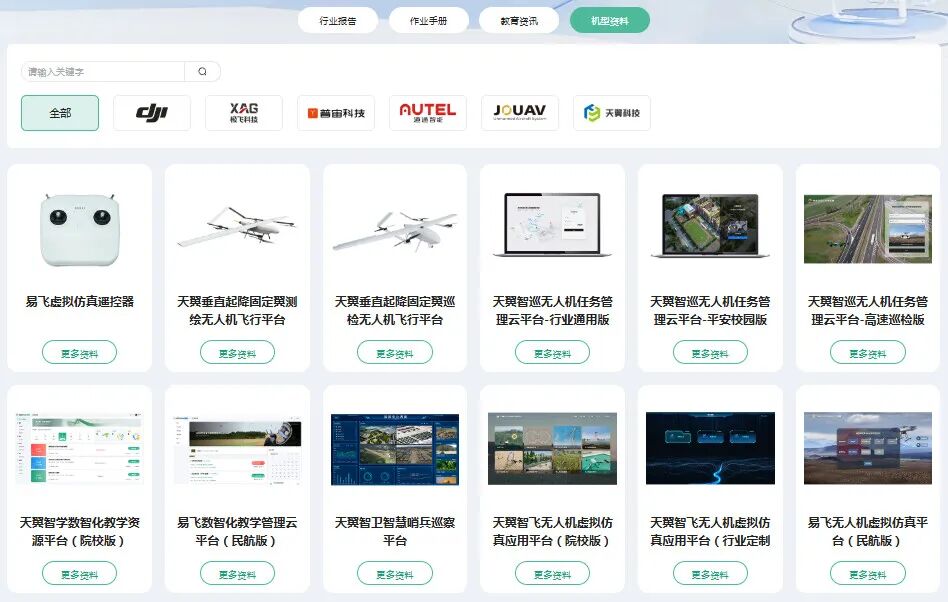 产业行业资料库模块是为了更好的助力院校老师,随时了解行业动态、产业发展及真实作业流程而设置的板块。里面共计涵盖高质量行业报告、法规标准、作业手册、教育资讯、机型资料等864个文件,借此模块推动教育与产业的有机衔接。