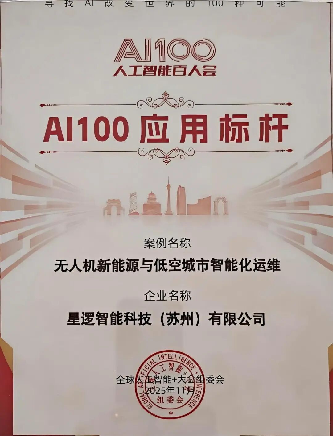 会上,星逻智能凭借《无人机新能源与低空城市智能化运维》荣获“人工智能百人会-AI 100应用标杆”称号。