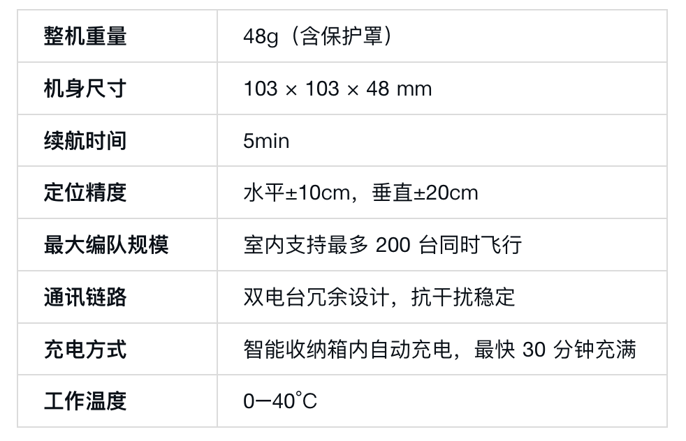室内最大支持 200 台同时编队飞行,双电台冗余通讯,工作温度 0–40°C。这意味着从基础 30 台的入门训练,到百台规模的高阶演练,Fylo Mini 都可以承载。