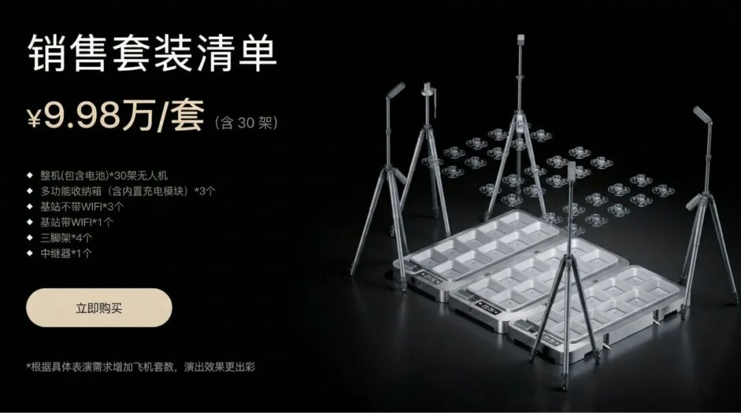 套装标准配件:整机(包含电池)*30架无人机、多功能收纳箱(含内置充电模块) *3个、基站不带WIFI*3个、基站带WIFI*1个、三脚架*4个、中继器*1个。