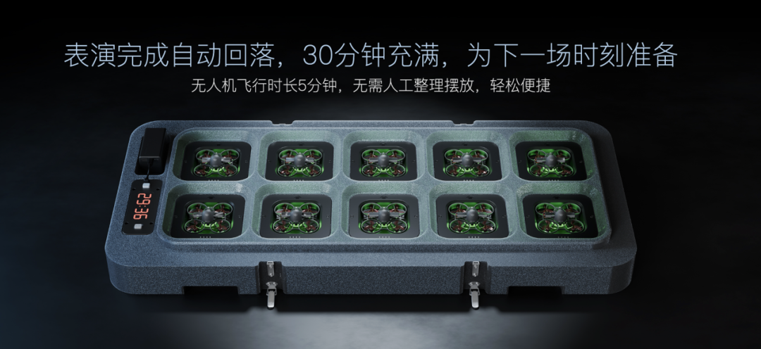 配套的智能收纳箱系统解决了另一个教学痛点:组织效率。每个收纳箱容纳 10 台飞机,置入即自动充电、自动编号,最快 30 分钟充满,全程无需手动配置。30 台的基础配置用 3 个收纳箱承载,课前 10 分钟内完成布场,课后回收同样简便,教学组织成本大幅降低。支持多基站级联,可随集群规模持续扩展。