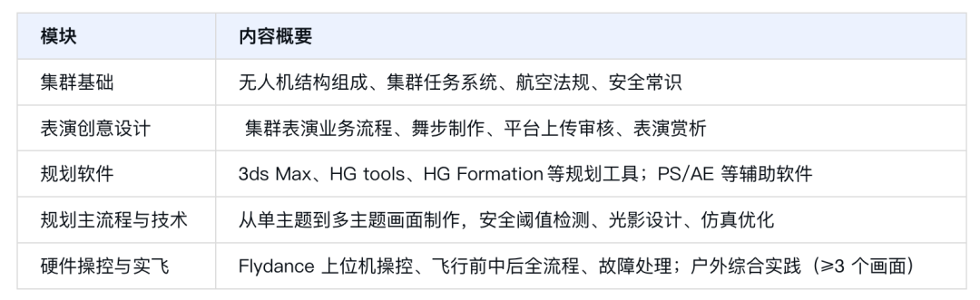 设备能解决“有机器飞”的问题,但职业能力的养成需要系统的课程结构。高巨创新为Fylo Mini 配套了《无人机集群规划与应用技术》课程,分五大模块,从集群认知到户外综合实飞全程贯通: