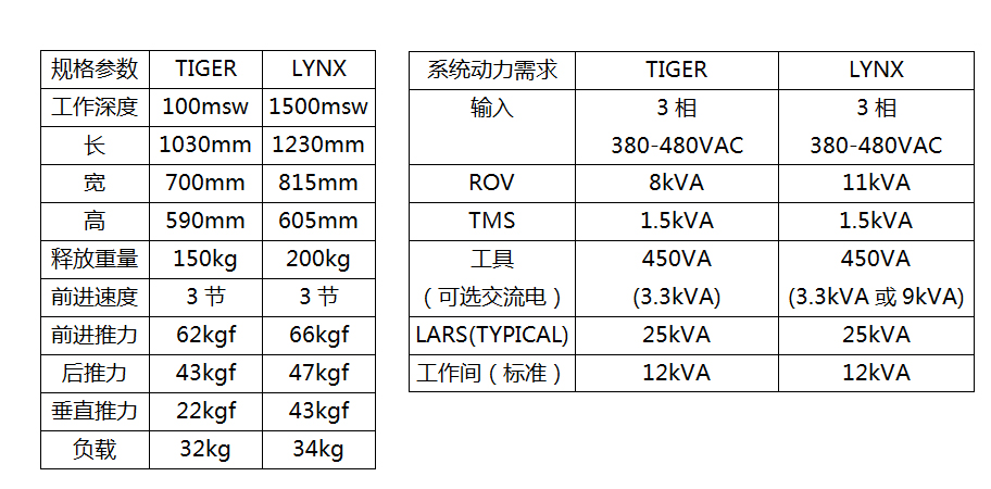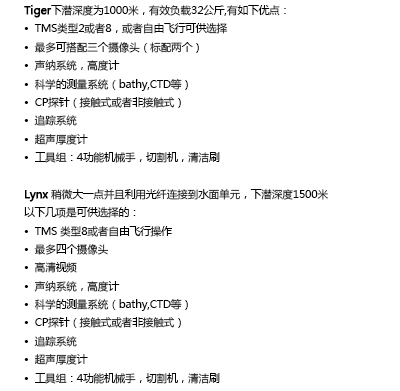 Tiger和Lynx的标定下潜水深为1000米和1500米,他们能在强水流和浑浊的海况下表现依旧非常稳定,并且提供稳定的操作性。