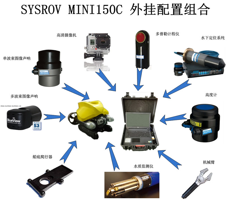 MINI 150C水下机器人包括:8.8Kg的机器人,控制台,50米水下专用电缆,用户手册和工具包。所有的配件都具备良好的水密性,整套系统都存储在专用运输箱中,系统总重30Kg,该运输箱可以很方便的用汽车运输或是航空托运。