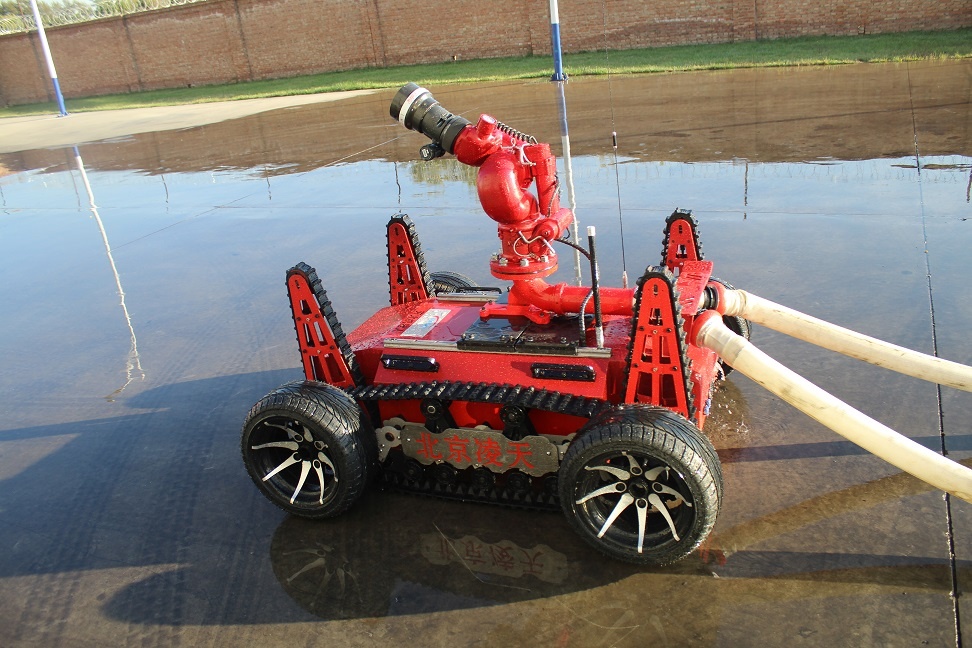 系统采用全地形结构,前后双摆臂和履带可应付几乎所有复杂地形,2×2金属轮胎在高速行走部署推进的同时,又保证了机器人的抗高温性能。