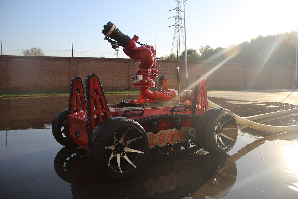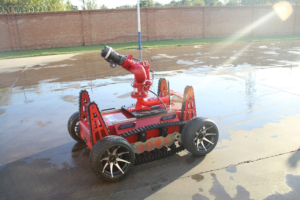 1、 采用前后4摆臂+履带+金属轮胎的结构形式,最大有效提高前进速度、越障性能,同时金属轮胎可以抗高温,适合在火区高温灭火救援。
