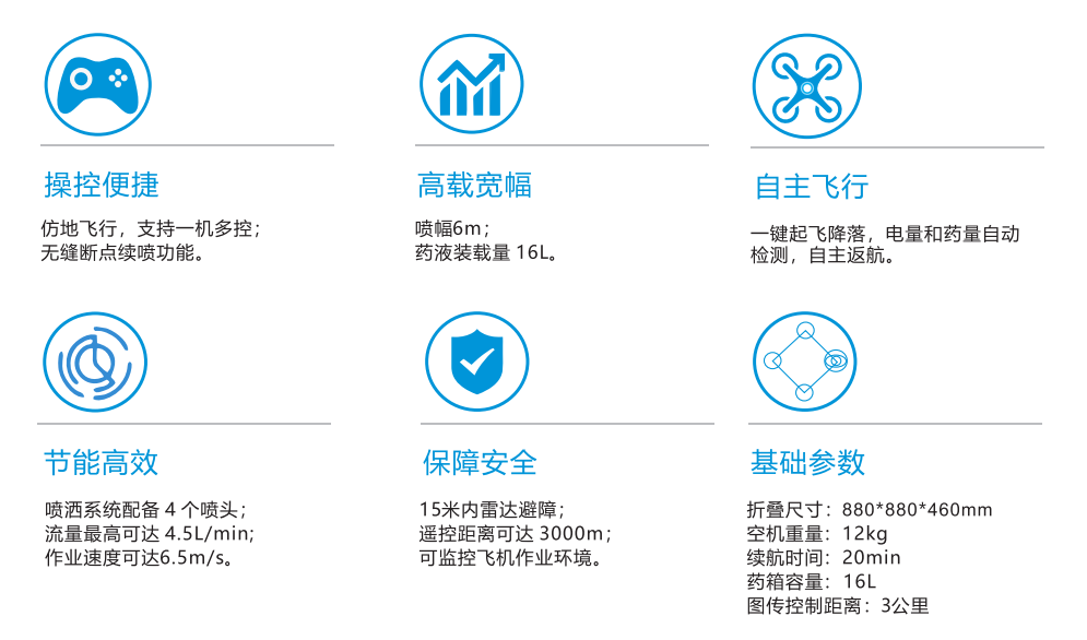 翼农-6S是一款应用于农林植保、农药喷洒的六旋翼植保无人机。该植保机喷洒系统配备4个喷头,可搭载16升药剂,6米喷幅,20分钟工作时间。
