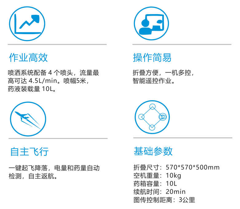 翼农-4Z是一款专门针对农林植保、农药喷洒研发的四旋翼植保无人机。该植保机采用碳纤维复合材料,防水防腐蚀,可搭载10升药剂,5米喷幅,20分钟工作时间。