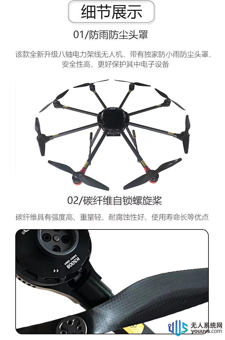 电力架线无人机使用场所特征:电力架线无人机适用于各种电力突发事件的处理。在很多电力架线建设施工过程中,常常会受到地形及环境特点的制约,比如架线过程须跨越一些江河、湖汊、工商业区、民居区、公路、铁路,或是山丘、峡谷、林业苗木区等等。这些因素致使施工成本成几何倍的增加、施工进度不得不拖延甚至中断,而施工质量也因此无法...”使用了电力架线无人机后,可以在任何的江湖、峡谷、山丘、林业苗木区等进行无障碍的电力架线施工,并且能大大的提高施工速度和效率,还能确保施工人员的安全