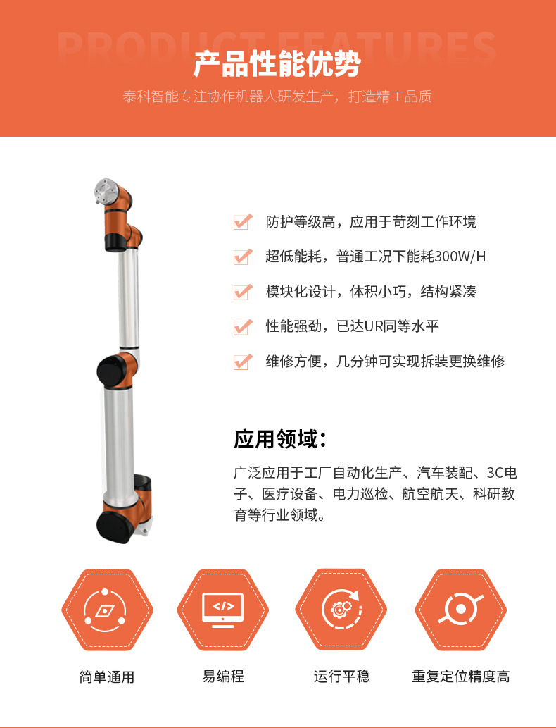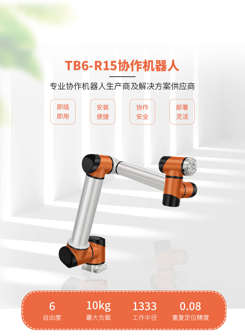 深圳泰科智能TB6-R15协作机器人自重仅为37KG,却拥有处理高达15KG的有效负载,工作半径可达1333mm,卓越的伸展能力和有效负载,能够处理更大型、高精准度领域的自动化作业任务。这款协作机器人功能强大、高自重负载比、高可靠性、模块化关节设计,易于末端扩展外部设备,可以实现快速安装部署。