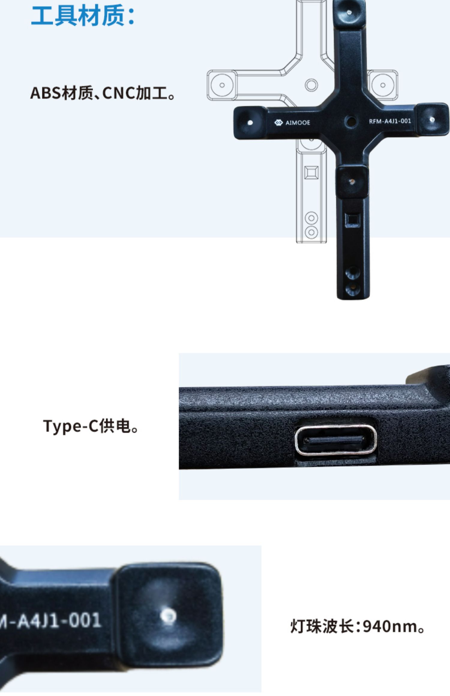 工具材质:ABS材质、CNC加工,Type-C供电,灯珠波长:940nm。