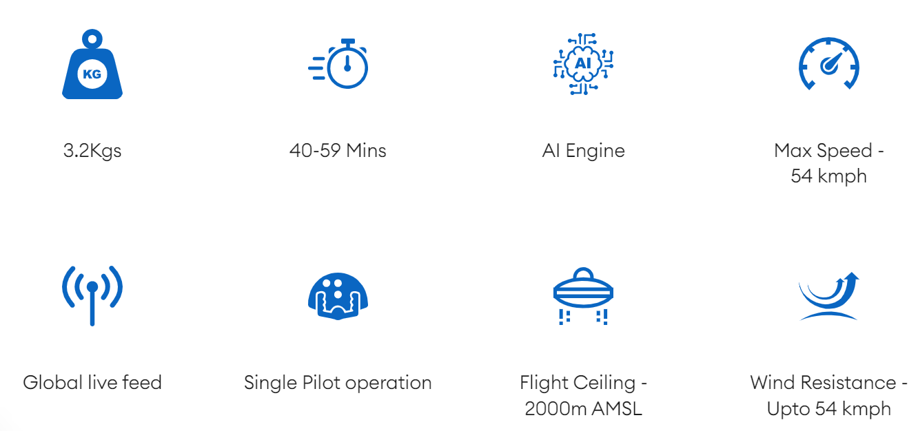 The UMT Hawk4G® Surveillancehas been designed to revolutionize the world of automated surveillance and tracking, with longer flight times and autonomous patrolling capabilities. It is India's first 4G drone- allowing viewing of live video feeds from anywhere in the world. Armed with Al-powered processing of the video feeds for human and object detection, the Hawk is a game-changer in security and reconnaissance.