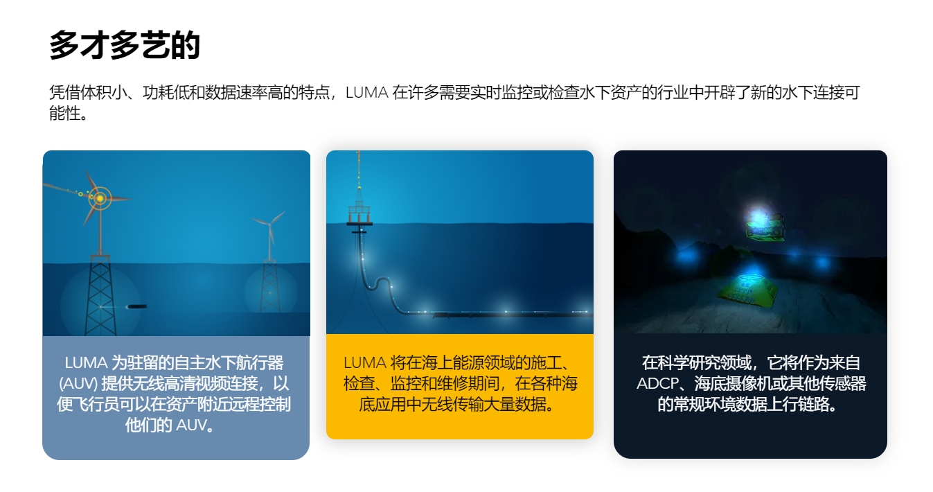 LUMA™ 是一系列光学调制解调器,结构紧凑、节能,可在水深达 12 公里的溅水区运行,通信速度高达 10 Mbit/s,范围可达 75 米。