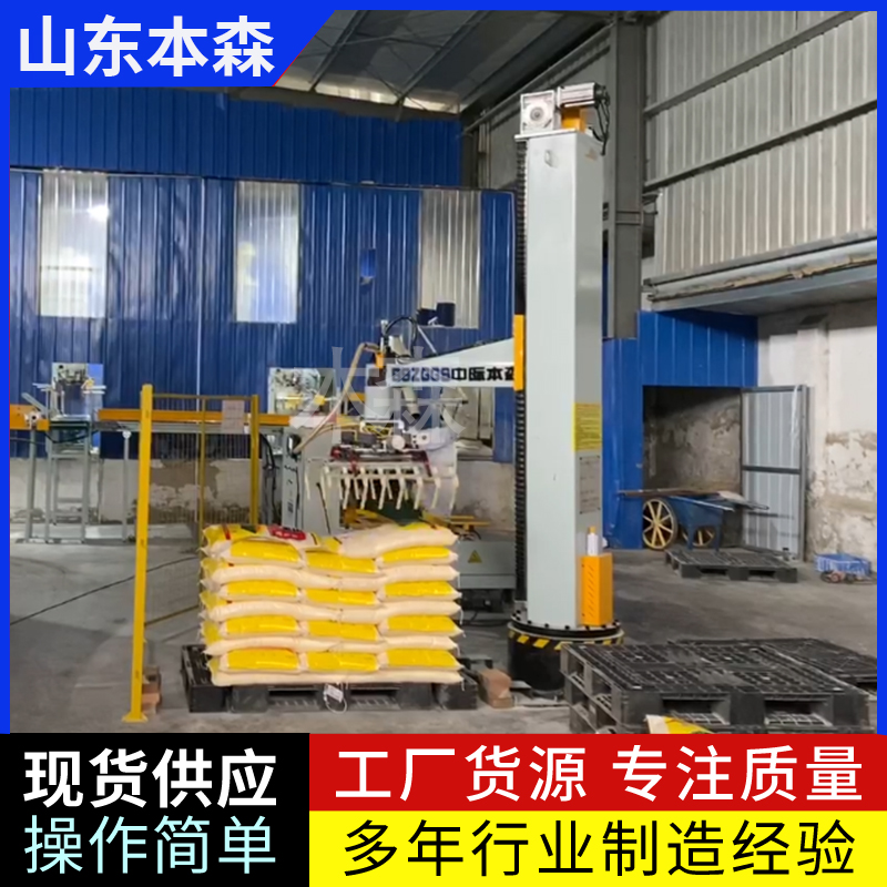 三、颗粒饲料输送立柱码垛机器人应用场景颗粒饲料输送立柱码垛机器人广泛应用于饲料加工厂、农业综合企业以及其他涉及大量物料包装和存储的行业。在这些行业中,机器人能够替代传统的人工码垛方式,实现自动化、智能化生产,提高生产效率和质量。