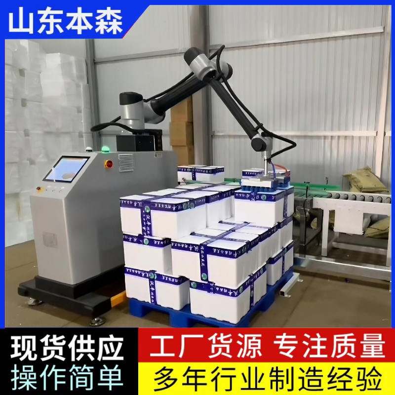 一、西兰花泡沫箱协作机器人码垛机械手定义西兰花泡沫箱协作机器人码垛机械手是一种集机械臂、传感器、控制系统于一体的自动化设备,专门用于泡沫箱的封箱、搬运及码垛作业。它结合了协作机器人的灵活性与码垛机械手的高效性,能够适应不同规格、重量的泡沫箱,实现全流程自动化操作。